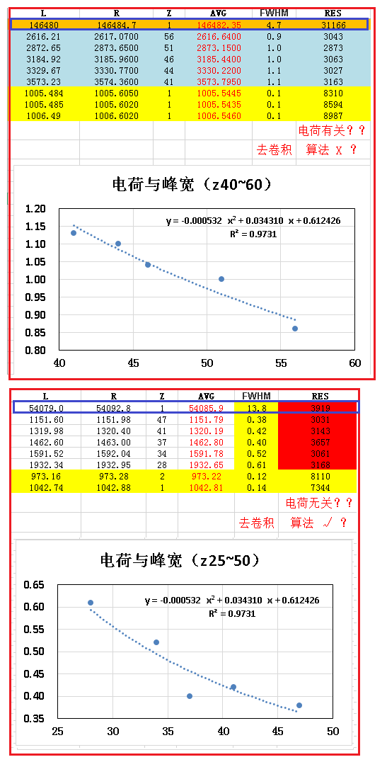 附图为我随机选的2个实测质谱分子量的部分截图,并计算了相关分辨率数据。结果发现,不同质谱仪及其算法对分辨率的影响较大。曾经有某家公司的算法里给出了质控结果,个人非常佩服那个算法。