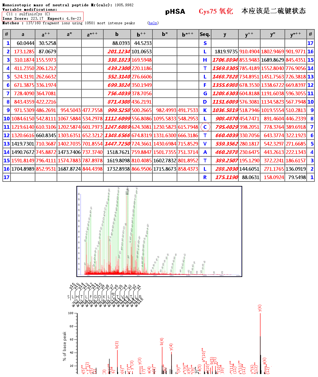 蛋白质中有多种氨基酸可发生氧化,其中人白的Cys常见多种氧化形式(自由巯基并非固定在Cys34上),此处给1个案例,人白Cys75发生1氧化,产生亚砜,且氧化率(亚砜率)较高。Cys亚砜化/砜化后,势必影响HSA二硫键的均一性。 ![]() 更多精彩文章,请关注公众号 【药网堂】 All rights reserved , visit the micromessage 药网堂 for more @ tofms_org@126.com ![]() 【wkh, 2023-03-03 09:26:33】 【责任人 wkh】 [已阅读 924 次] |